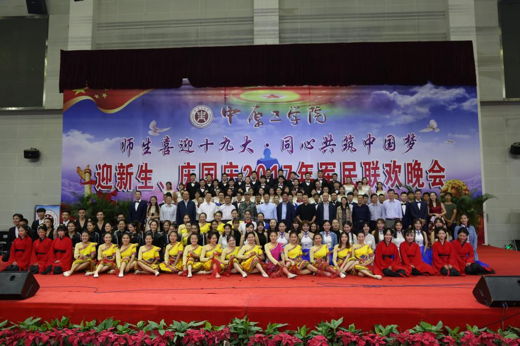 微风送细雨,凉凉秋意来。9月27日晚7点,“师生喜迎十九大·同心共筑中国梦”迎新生、庆国庆2017年军民联欢晚会在南区体育馆隆重举行。我校党委副书记刘志刚,军训部队首长靳宝,党委学工部部长、学生处处长田华泉,保卫处处长贾朝业,团委书记张志增,党委宣传部副部长曲光华,全体军训教官,各学院党总支副书记,团总支书记,新生班辅导员以及2017级全体新生一同观看了晚会。