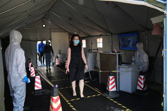 在学校东大门,学生到达后,扫码进入测温通道,接受红外体温检测和签到码审核。工作人员针对学生报到时出现发热的紧急情况进行了应急演练。