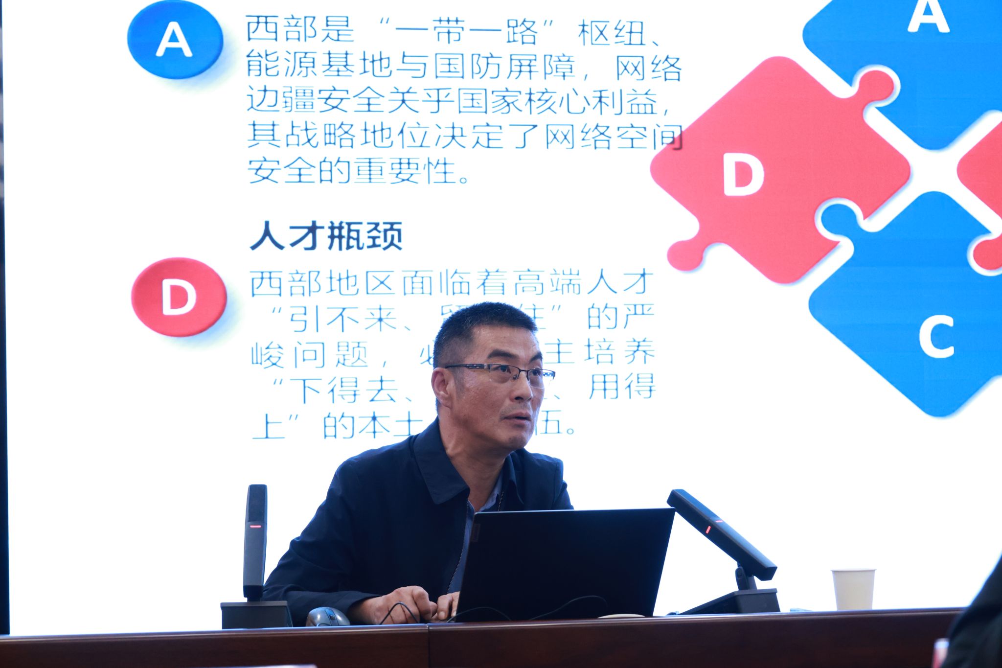 安德智作“扎根西部,守护网安——甘肃政法大学网安人才培养模式汇报”专题报告,系统阐述西部地区网络空间安全学科发展现状,详细介绍了该校在专业人才培养模式上的探索与实践成效。