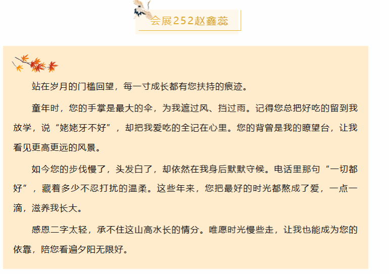 营造节日氛围,让传统节日温情浸润校园深入人心。经济管理学院以字为媒,组织开展“重阳寄情”祝福征集活动,并将优秀作品进行展示,作品诗意盎然、质朴动人,重温了重阳传统习俗,抒发了对长辈感恩之情,传承了尊老敬老中华美德。智能建造与建筑工程学院开展“志愿暖行践美德”行动,在银杏树旁,感谢清洁工维护校园环境;在学校大门,致敬值守保安守护校园安全;在餐厅内外,为保洁阿姨送上节日关爱祝福。(通讯员 耿伟杰)