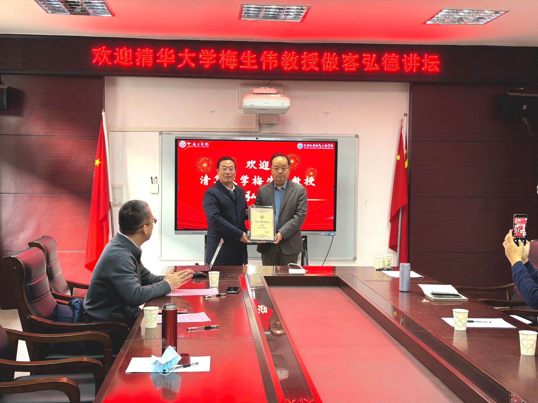 会前,张纪峰代表学校向梅生伟教授颁发“弘德讲坛”荣誉证书,并对梅生伟教授的到来表示欢迎与感谢。