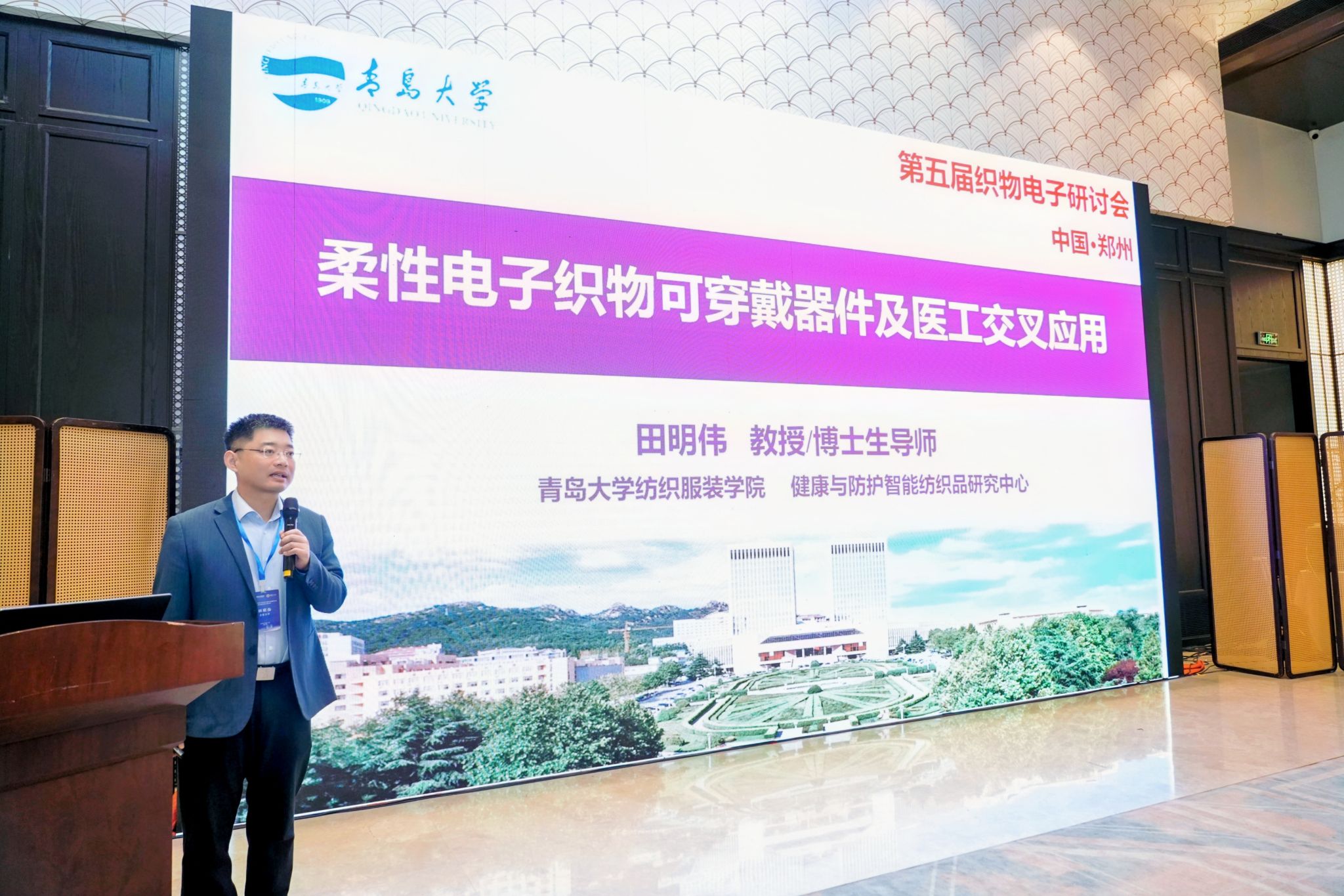 田明伟做《柔性智能电子织物可穿戴器件及医工交叉应用》主题报告,即面向“健康中国”“体育强国”国家战略需求,创新性地引入“力敏电子织物器件”新思路,创制体育健康用智能电子纺织品。他指出,实现“织物即设备”的关键在于打破学科壁垒,将电子信息技术的“智能”与纺织材料的“柔性”及医学的“临床需求”进行深度融合。