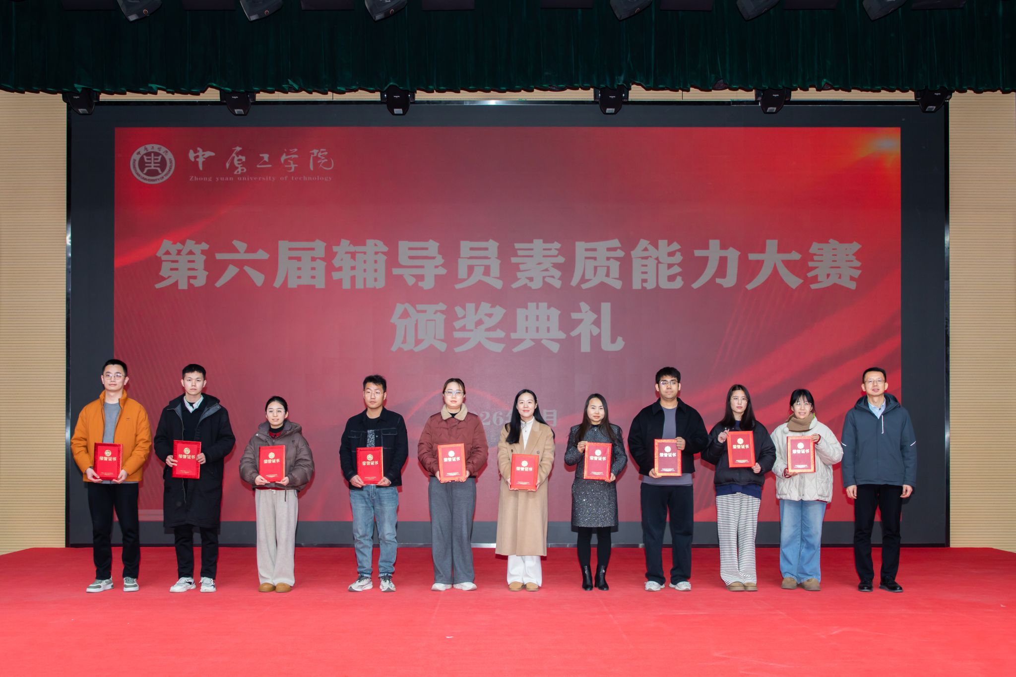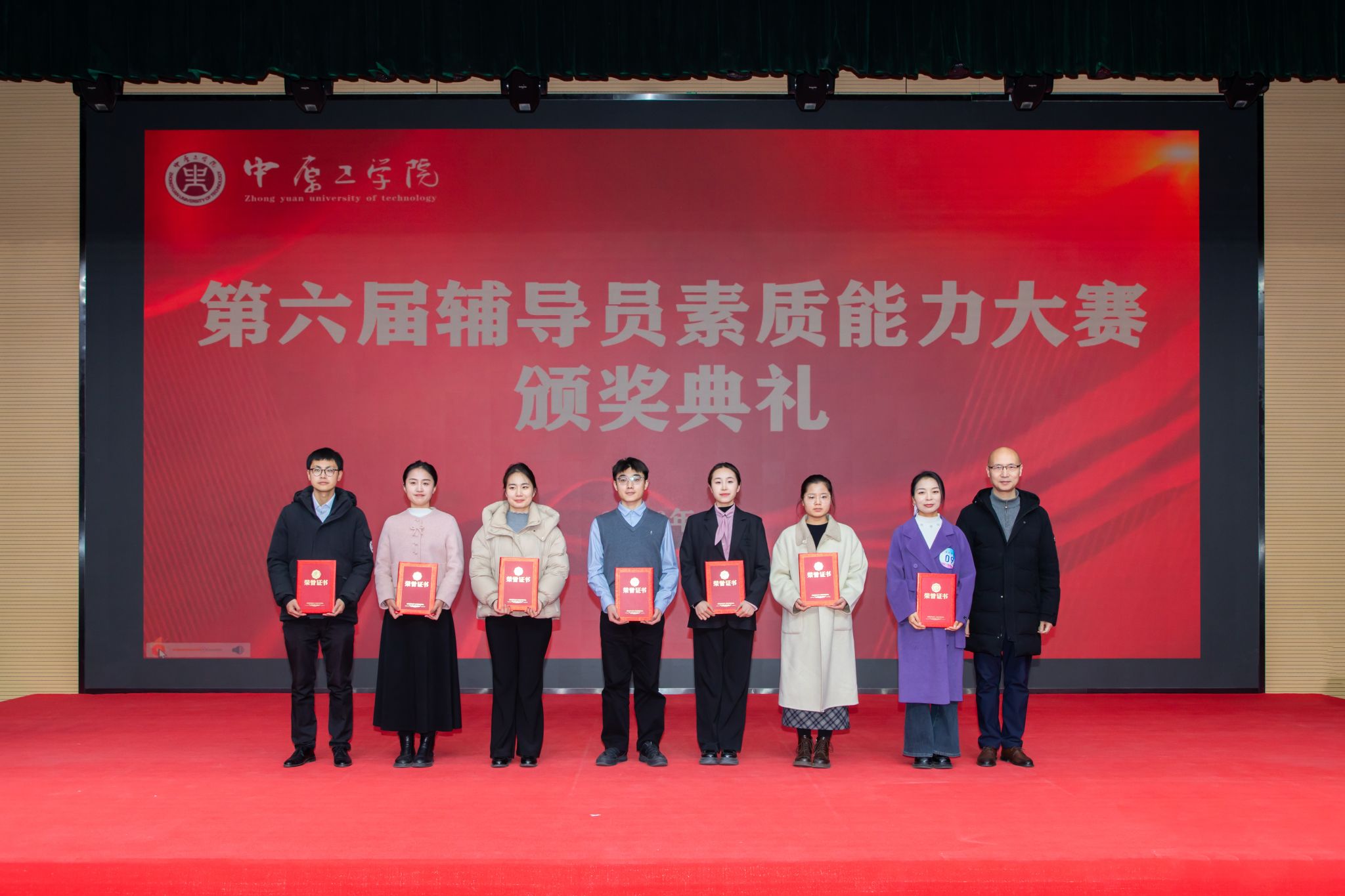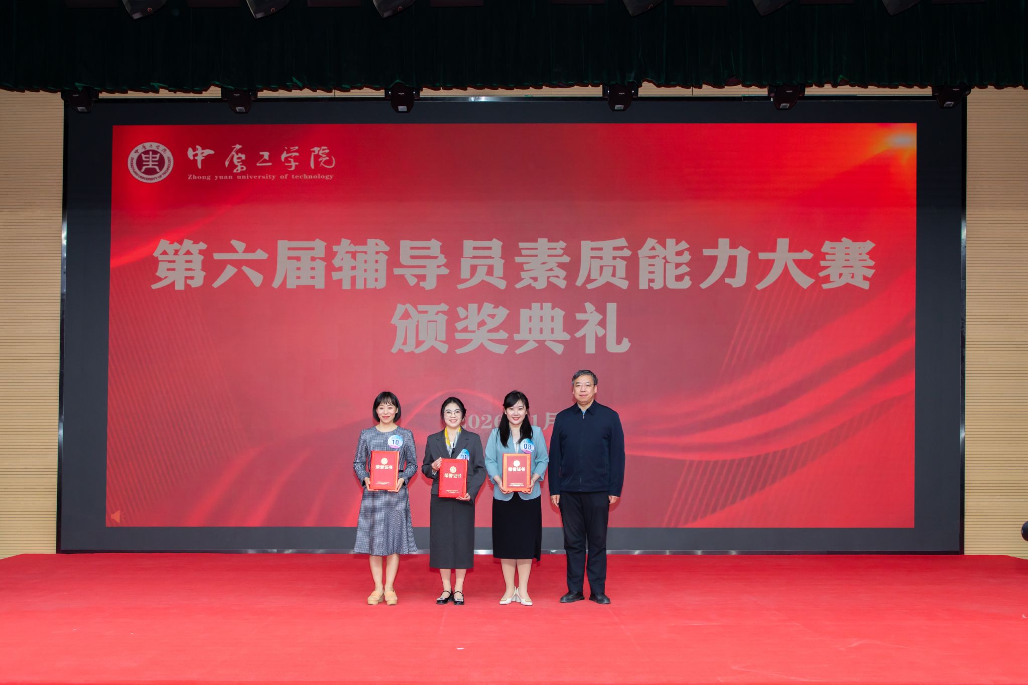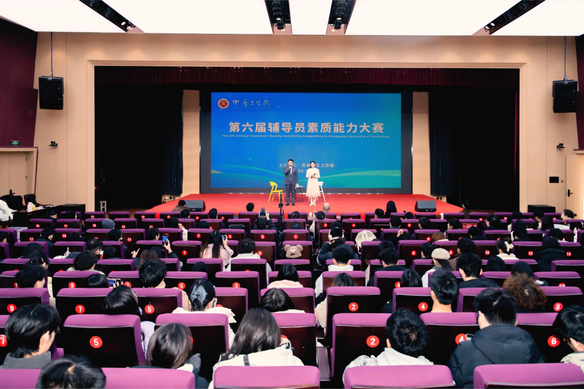 为切实提升辅导员队伍的政治素养、理论水平和职业能力,我校于近日举办第六届辅导员素质能力大赛,比赛由校党委学生工作部主办,经济管理学院、材料电子与储能学院承办。1月6日,辅导员素质能力大赛决赛暨颁奖典礼在龙湖校区举行,校党委副书记、工会主席宋晓炜出席活动,河南省第九届辅导员素质能力大赛特等奖获得者何迎亚、张俊受邀担任校外评委嘉宾,相关职能部门负责人、各学院学生工作负责人、全体专兼职辅导员及学生代表共同参与观摩。
