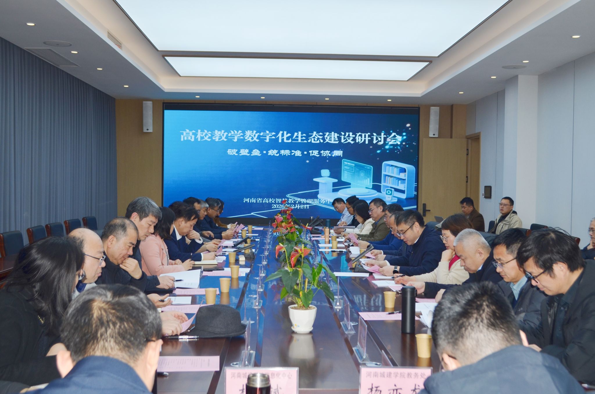 2月2日,由河南省高校智慧教学管理服务中心主办的“破壁垒·统标准·促协同:高校教学数字化生态建设研讨会”在我校龙湖校区召开。河南省教育厅高等教育处处长闫治国、科技与信息化处一级调研员施晓春,河南师范大学、华北水利水电大学等8所高校的教务处及信息化部门负责人齐聚一堂,共商高校教学数字化生态建设大计。我校副校长杨坤主持会议。