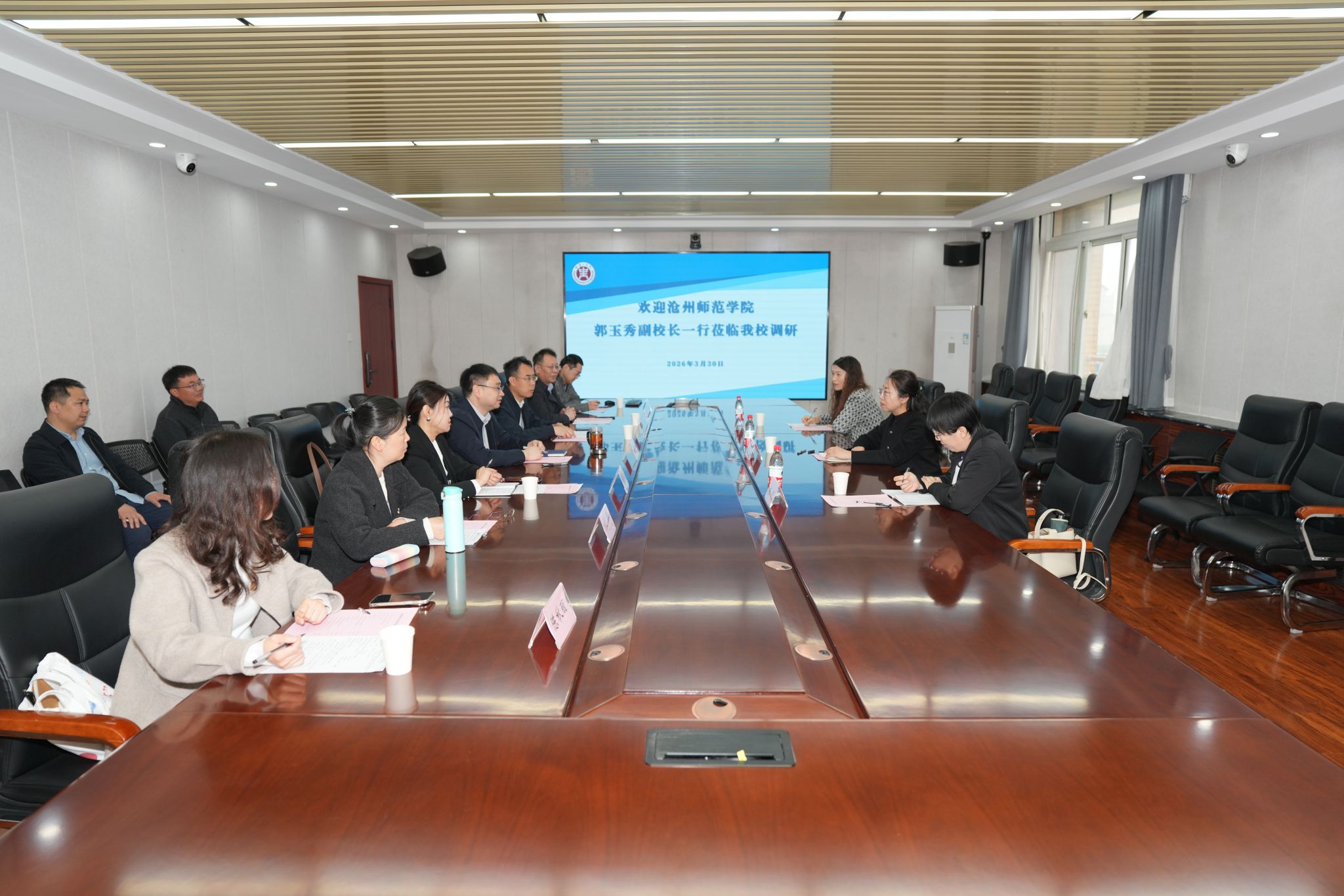 会上,杨坤对郭玉秀一行表示欢迎,结合观看学校宣传片,系统介绍了学校的发展历程和在本科教育教学方面取得的进展。郭玉秀介绍了沧州师范学院的办学历史及当前发展现状,表示希望在课程建设、工程教育专业认证和学科专业结构调整等方面加强交流。双方围绕智慧课程建设、工程教育专业认证、学科竞赛、专业建设等方面进行了深入交流和经验分享。