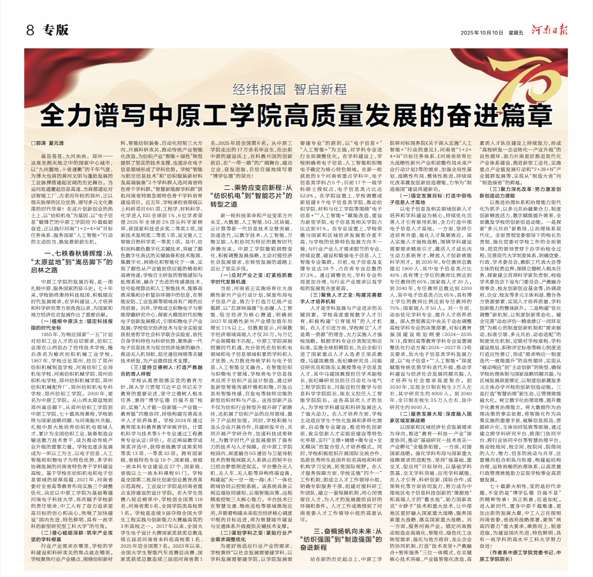 10月10日,河南日报刊发我校党委书记郭涛,党委副书记、校长夏元清署名文章:全力谱写中原工学院高质量发展的奋进篇章,全文如下: