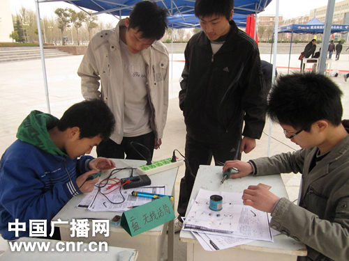 中广网河南分网消息 3月19日,在中原工学院首届科技创新制作大赛上,该校大学生利用自制的氢气将气球飞上了天空,而所用的材料一部分来自市区的化工店,另一部分则来自龙湖镇废品收购站。此外他们还自制了微型电台、无线话筒、甚至验证了常人看来不可能的无线输电技术。