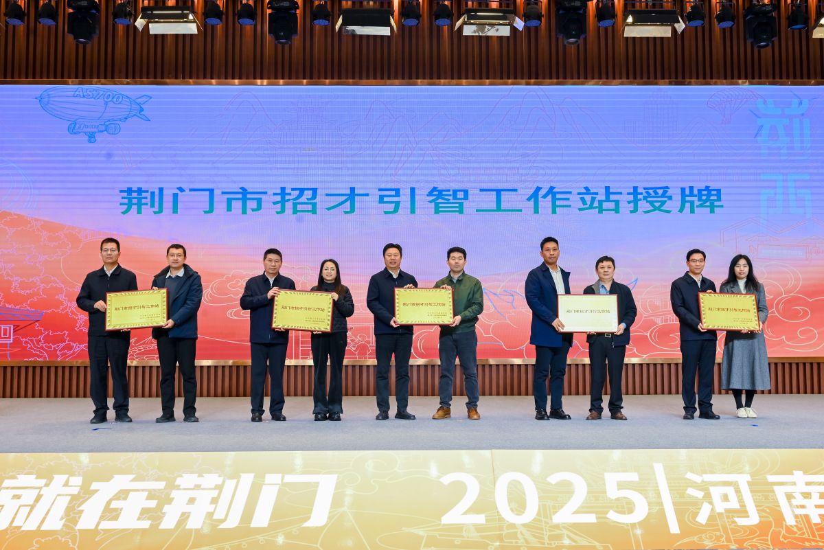活动启动仪式在荆门国际会展中心举行。荆门市人力资源和社会保障局为我校颁发了“招才引智工作站”与“就业实践基地”牌匾。