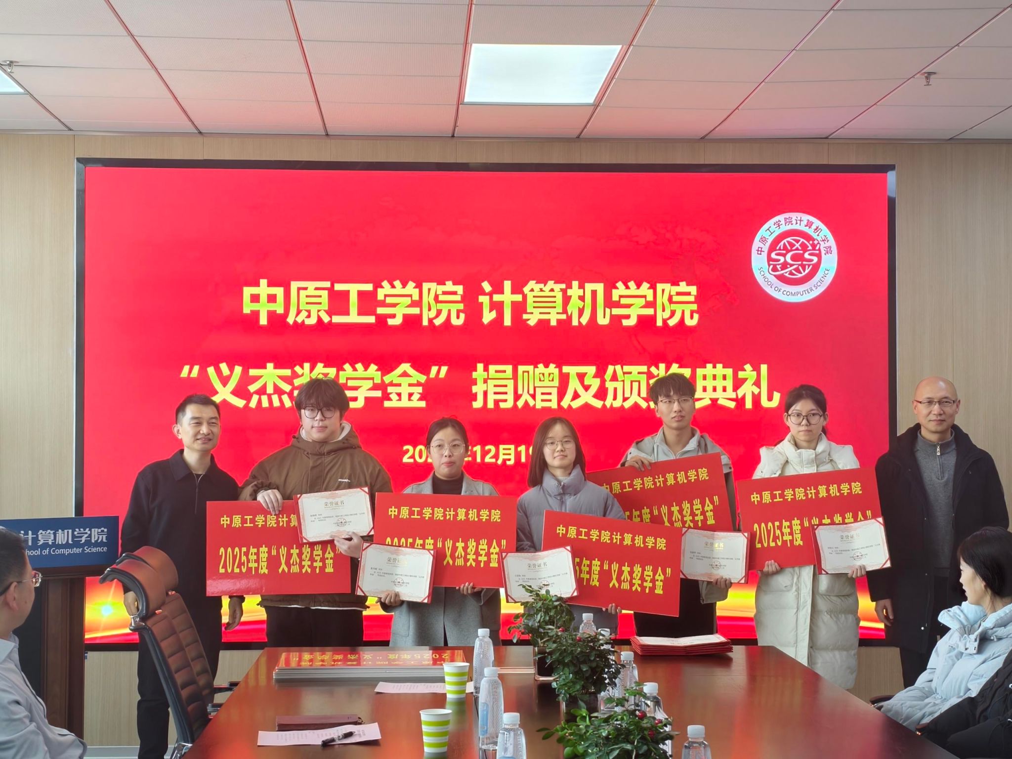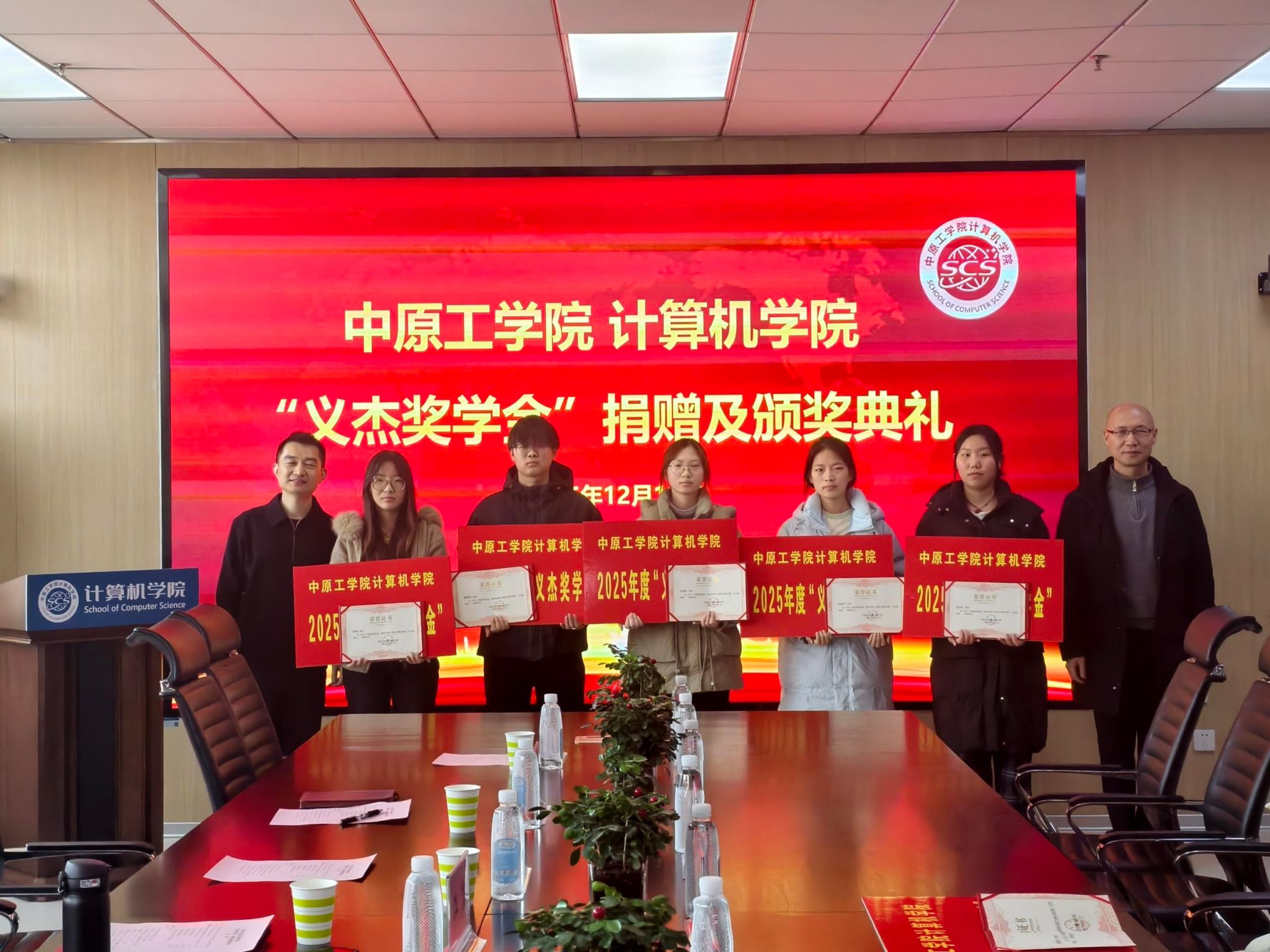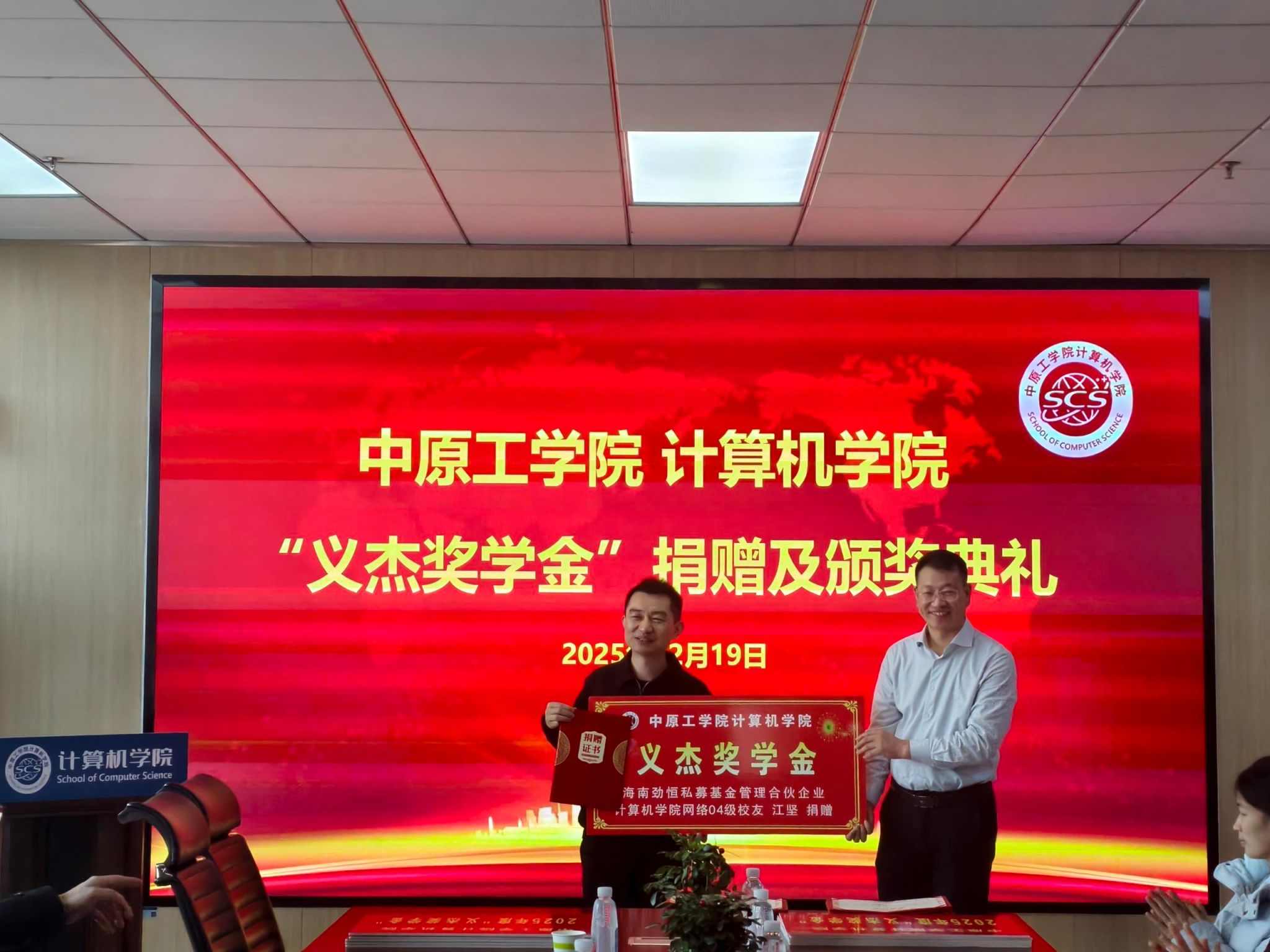 12月19日,我校计算机学院校友奖学金——“义杰奖学金”捐赠暨颁奖典礼在龙湖校区举行。奖学金捐赠人、海南劲恒私募基金管理合伙企业总经理江坚,后勤服务中心党总支书记李士杰,就业指导中心副主任、创新创业学院副院长周全营,计算机学院党委书记苗凤君、执行院长张书钦等与辅导员、获奖学生代表共同参加。典礼由计算机学院党委副书记侯向花主持。