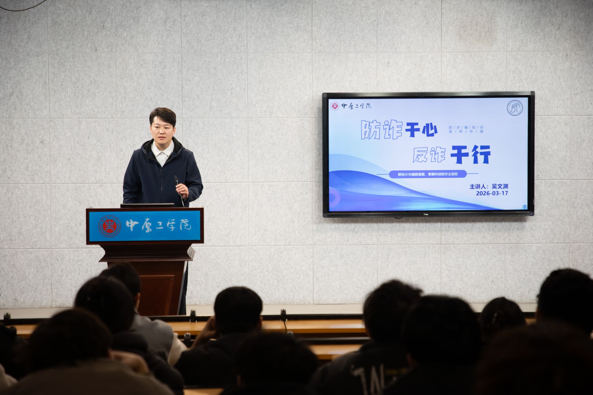 反诈安全知识讲座中,吴文渊结合多年反诈一线工作经验,阐述了电信诈骗的概念、涉诈黑灰产业链的运作机制及其带来的危害,详细介绍了7种常见的电信诈骗案件类型,全面拆解校园高发电信诈骗的作案套路,引导同学们规避被骗风险。他紧密围绕校园反诈的现实需求,强调了AI时代诈骗手段的新特点,普及了AI反诈技术的应用实践,指导同学们要巧妙运用科技手段,构筑起坚固的个人反诈安全防线。
